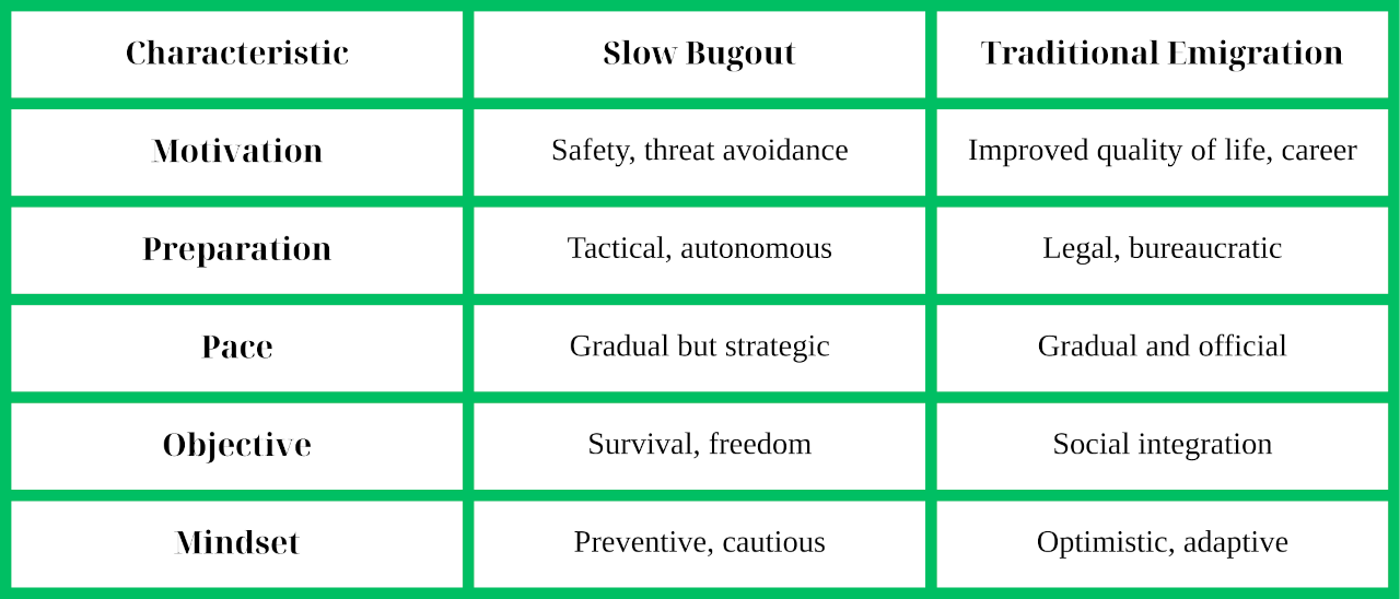 Although a slow bugout may resemble emigration on the surface, its motivation and methodology are fundamentally different.